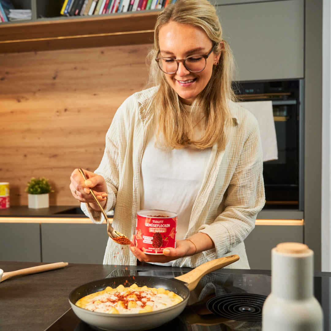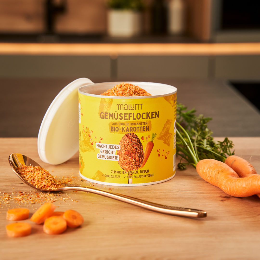 Aus dem Grund sind die Gemüseflocken als neues Produkt in unsere Gemüsewelt eingezogen, damit ihr auch zuhause ganz einfach mehr Gemüse bekommt.