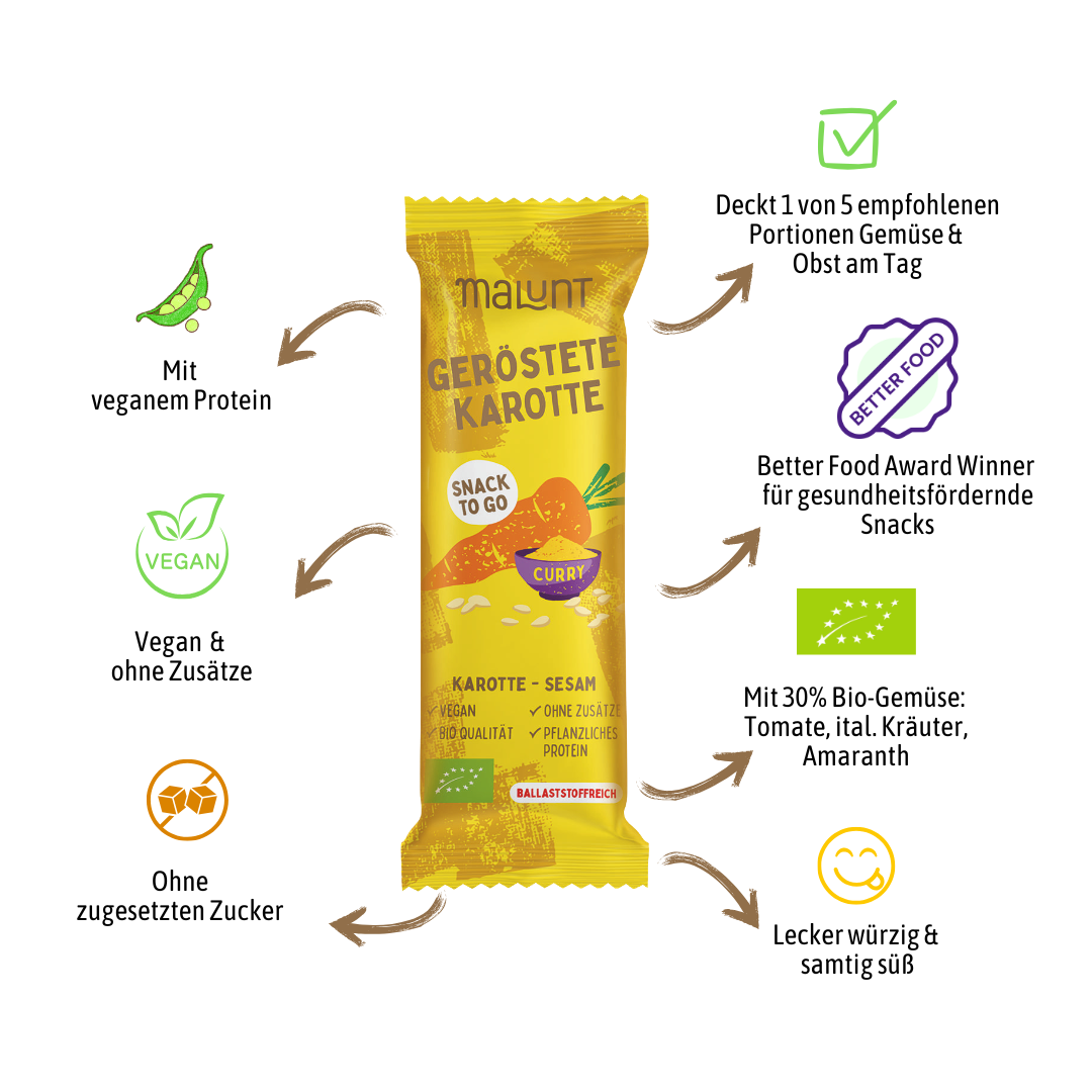 Gibt es neben dem Gemüse noch weitere Zutaten in den Gemüse-Riegeln? Neben viel Gemüse enthalten die malunt-Riegel auch pflanzliche Proteine, Gewürze, Kräuter und Saaten. Dank dieser Kombination sind die malunt-Riegel viel mehr als "nur" Gemüse – sie sind eine gesündere, sättigende Zwischenmahlzeit, die den Körper mit wertvollen Nährstoffen versorgt und gleichzeitig hilft, mehr Gemüse in den Alltag zu integrieren. Und das ohne künstliche Zusätze – einfach natürlich lecker!