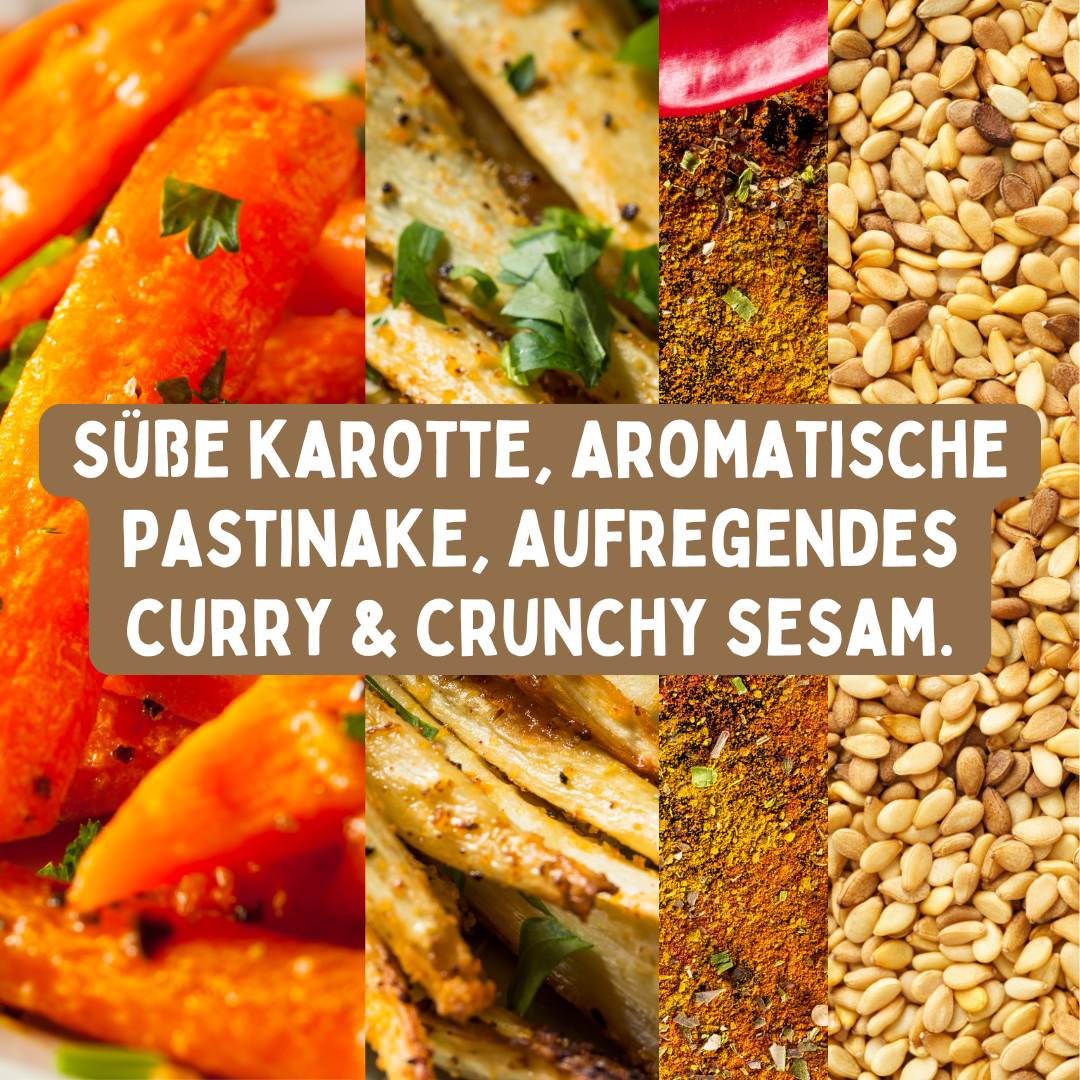 Mit dem neuen Bio-Gemüse-Riegel Geröstete Karotte bekommst du einen Hauch Orient zu dir nach Hause. Vollmundig herzhaft mit einer leichten Süße durch geröstete Karotten, aufregendem Curry und crunchy Sesam.