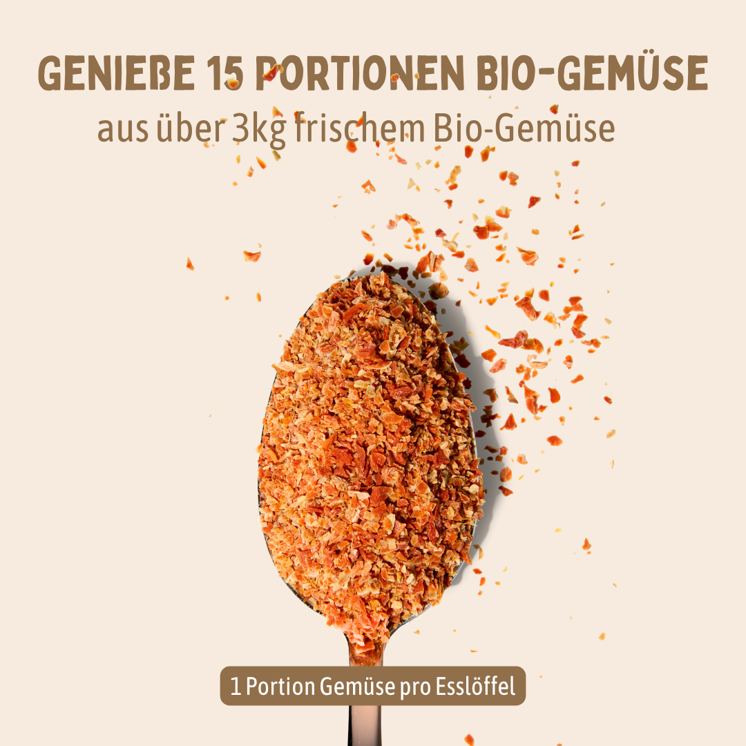 In jeder Dose stecken 225 g schonend getrocknetes Bio-Gemüse – das entspricht je nach Sorte bis zu 3 kg frischem Bio-Gemüse.