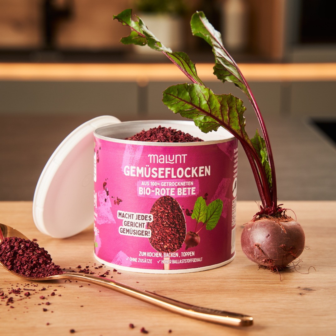 Mit malunt kannst du ganz einfach noch mehr Gemüse in deinem Alltag integrieren. Denn unsere neuen Flocken aus 100% purem Bio-Gemüse sind das perfekte Upgrade für jedes Gericht.Ohne weitere Zubereitung können die Gemüseflocken zum Kochen, Backen und Toppen eingesetzt werden. Dose auf. Löffel rein. Flocken streuen. Fertig.